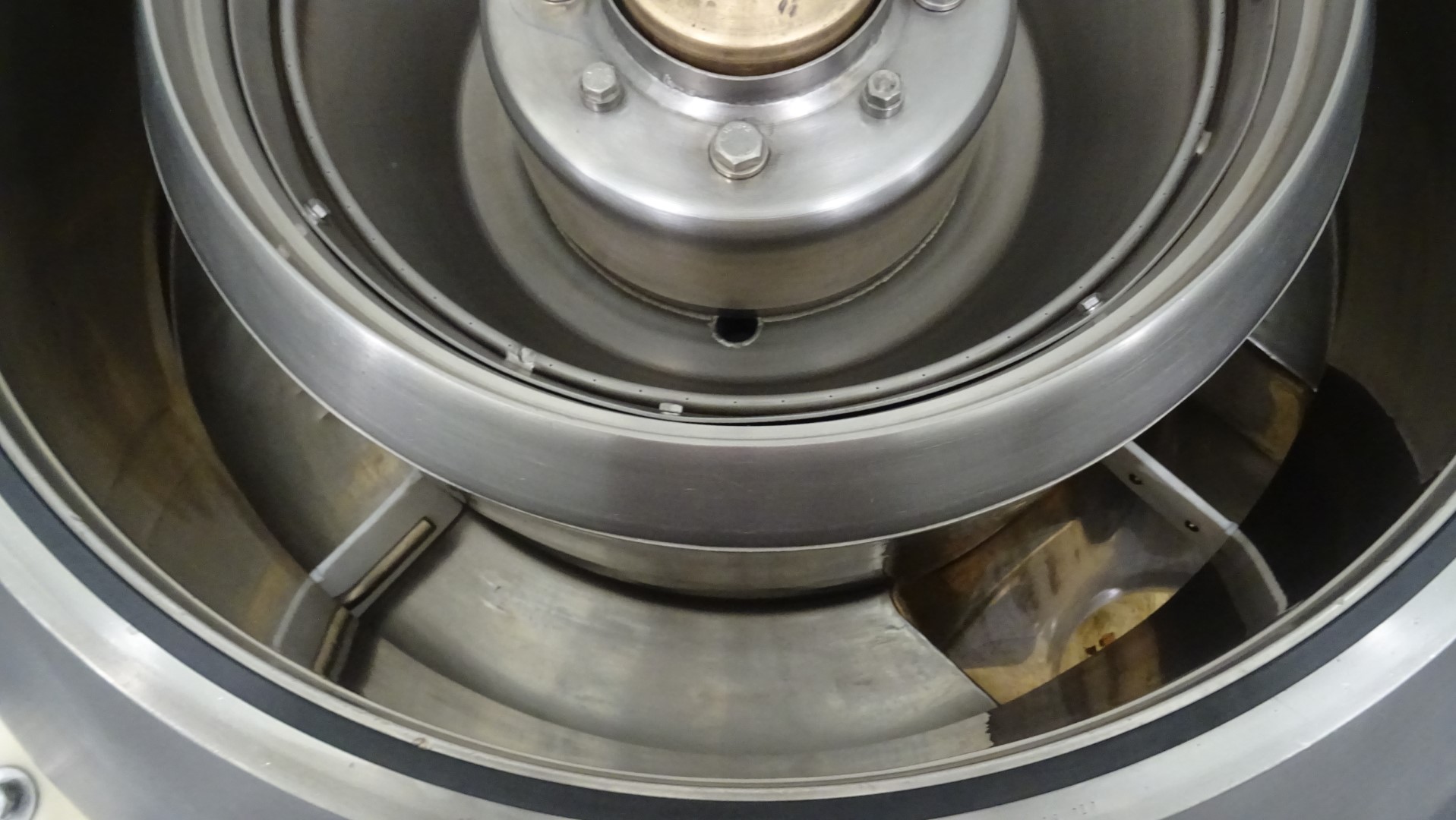 Separator. Das in der geronnenen Milch enthaltene Eiweiß wird in der rotierenden Trommel von der Molke getrennt und