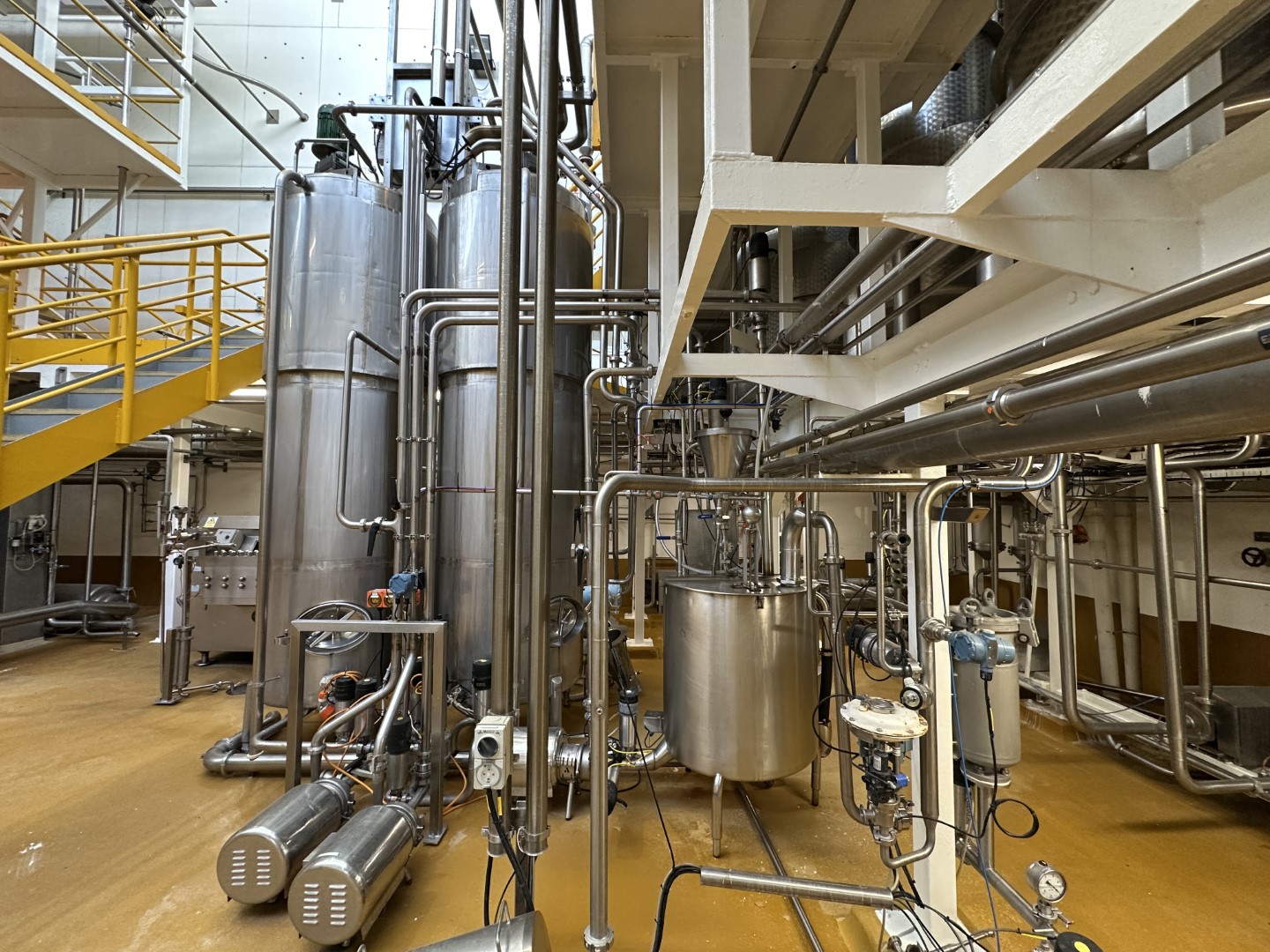 Gebrauchte komplette Pulveranlage bestehend aus Verdampfer (4-stufig, TVR), Hochdruckpumpe (Homogenisator) und Sprühtrockner. Bisher für Vollmilchpulver (WMP) verwendet. Die Linie hatte einen Input von ± 280.000 Liter Vollmilch pro Tag und eine Leistung von ± 28.000 kg WMP pro Tag. Noch im Werk montiert. Die Hauptkomponenten der Linie: - Verdampfer, 4-stufig, TVR Hersteller: Tebel - Van der Ploeg Typ: Fallfilmverdampfer Stufen: 4-Effekt (Stufe 3 und 4 werden später zur besseren Wärmeübertragung in 2 unterschiedliche Stufen aufgeteilt, 1-2-3ab-4ab) Rohrdurchmesser aller Stufen: 35 mm Vorwärmer Jahr: 1975 Langes und kurzes Halterohr Kapazitätseingang für Vollmilch: ± 13.000 Liter pro Stunde (± 11,2% TS) Kapazitätsleistung für Vollmilch: ± 3.000 kg pro Stunde (± 48 % TS) Kapazitätseingang für Magermilch: ± 14.500 Liter pro Stunde (± 8,8 % TS) Kapazitätsleistung für Magermilch: 3.000 ± Liter pro Stunde (± 48 % TS) Kapazitätseingang für Molke: ± 16.500 Liter pro Stunde (± 6 % TS) Kapazitätsleistung für Molke: ± 3.000 Liter pro Stunde (± 48 % TS) Einschließlich Sahnezufuhrtank, 12 Pumpen, 4 Vakuumpumpen, sämtliche Verbindungsrohre / pneumatische Ventile und Relais Bedienelemente. - Hochdruckpumpe / Homogenisator Hersteller: AVP Typ: 42.118 Jahr: 2006 Kapazität: bis zu 4.800 Liter pro Stunde Druck: bis 410 bar Anzahl Stufen: 1 Homogenisierungsventil Einschließlich: aller Verbindungsrohre/Ventile und Steuerungen. - Sprühtrockner Hersteller: DeLaval / Stork Typ: Düse Jahr: 1975 - 1985 - 2022 Kapazitätsleistung für Vollmilchpulver: ± 1.200 kg pro Stunde (WMP) Kapazitätsleistung für Magermilchpulver: ± 1.200 kg pro Stunde (SMP) Kapazitätsleistung für Molkepulver: ± 1.200 kg pro Stunde (WP) Einschließlich: Wirbelschichttrockner, Zyklone, Öl-/Lufterhitzer, sämtliche Verbindungsrohrleitungen/Ventile und Steuerungen. - Demontage und Verladung Die Demontage und das Verladen in Container ist im Preis inbegriffen, der Kunde kann dies auf Wunsch aber auch selbst durchführen. geht zu Lasten des neuen Eigentümers. Zusatzfunktionen: Auf Anfrage können aus dem gleichen Werk folgende Produkte angeboten werden: * Komplette vorhandene Milchbehandlungslinie mit AVP H17 Milchpasteur, Alfa Laval MRPX 318 TGV Separator, APV Rahm Pasteurisator, alle Pumpen, Verbindungsrohrleitungen/Ventile und Steuerungen. * Milchannahmestation mit CIP der LKWs. * CIP-Set des Sprühtrockners/Verdampfers. * 2 x 20 t Lagerbehälter und 1 x 10 t Verpackungsbehälter. * Lacthose-Rekombinationssystem. * 2x Luftkompressoren.