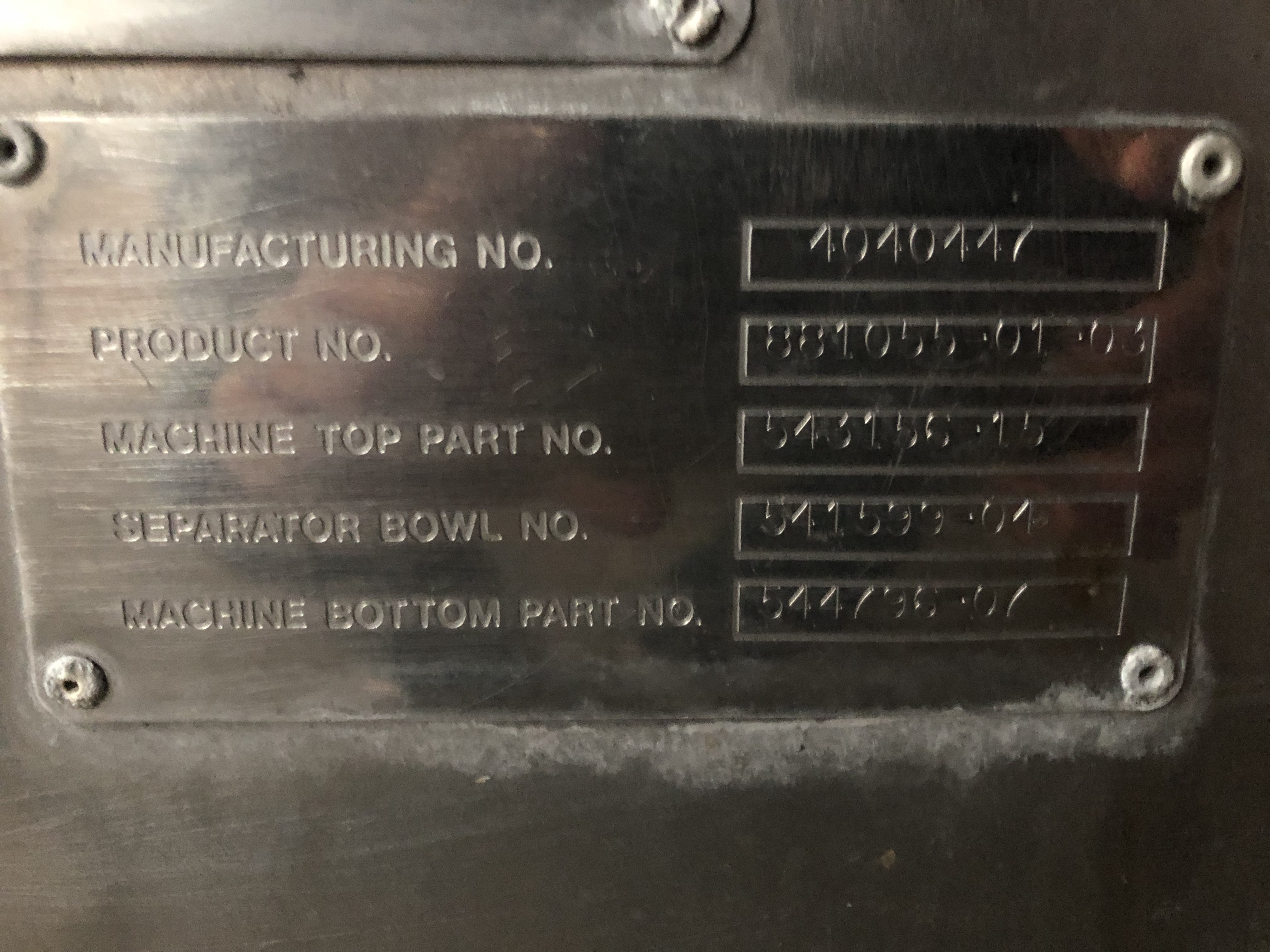 This separator is a Alfa Laval HMRPX 518 HGV-74C-50 cream separator. Separators separate the raw milk into cream and skimmed milk. This separation is necessary to be able to extract different products from the raw milk, such as low-fat milk, whole milk, cream etc..