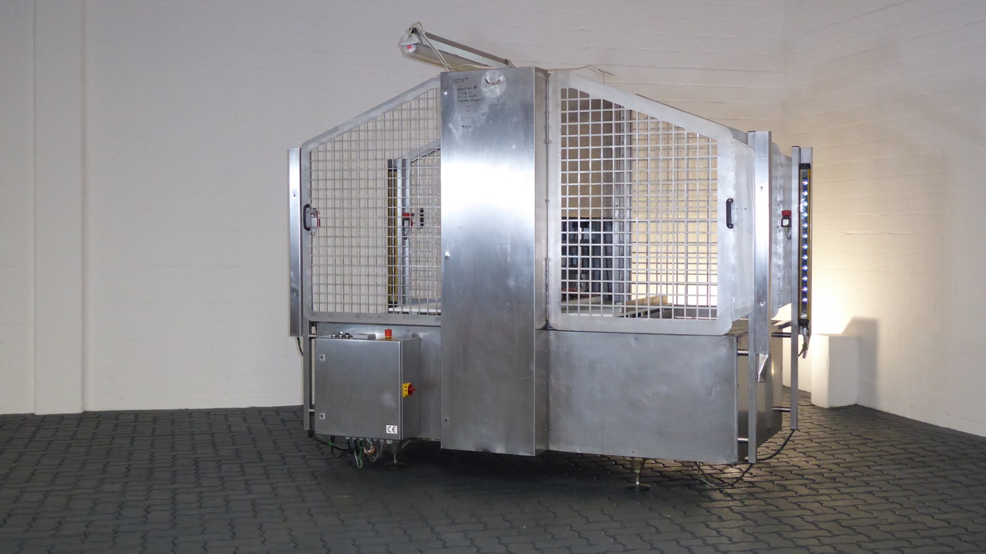 Diese Käseteilmaschine verfügt über einen manuell drehbaren Drehteller. Damit können Käselaibe und -ringe in Segmente (Keile) sowie Käselaibe und -riegel in Stäbchen mit frei wählbarer Stäbchenbreite geschnitten werden. Durchmesser des Drehtellers: 100 cm. Schneidmesserlänge: 105 cm. Die Maschine wurde bisher für Gouda-, Butterkäse- und Tilsiter-Laibe (1–2 kg) eingesetzt. Lichtschutz (Sick). Bedienfeld mit SPS-Steuerung. Ersatzmesser erhältlich.