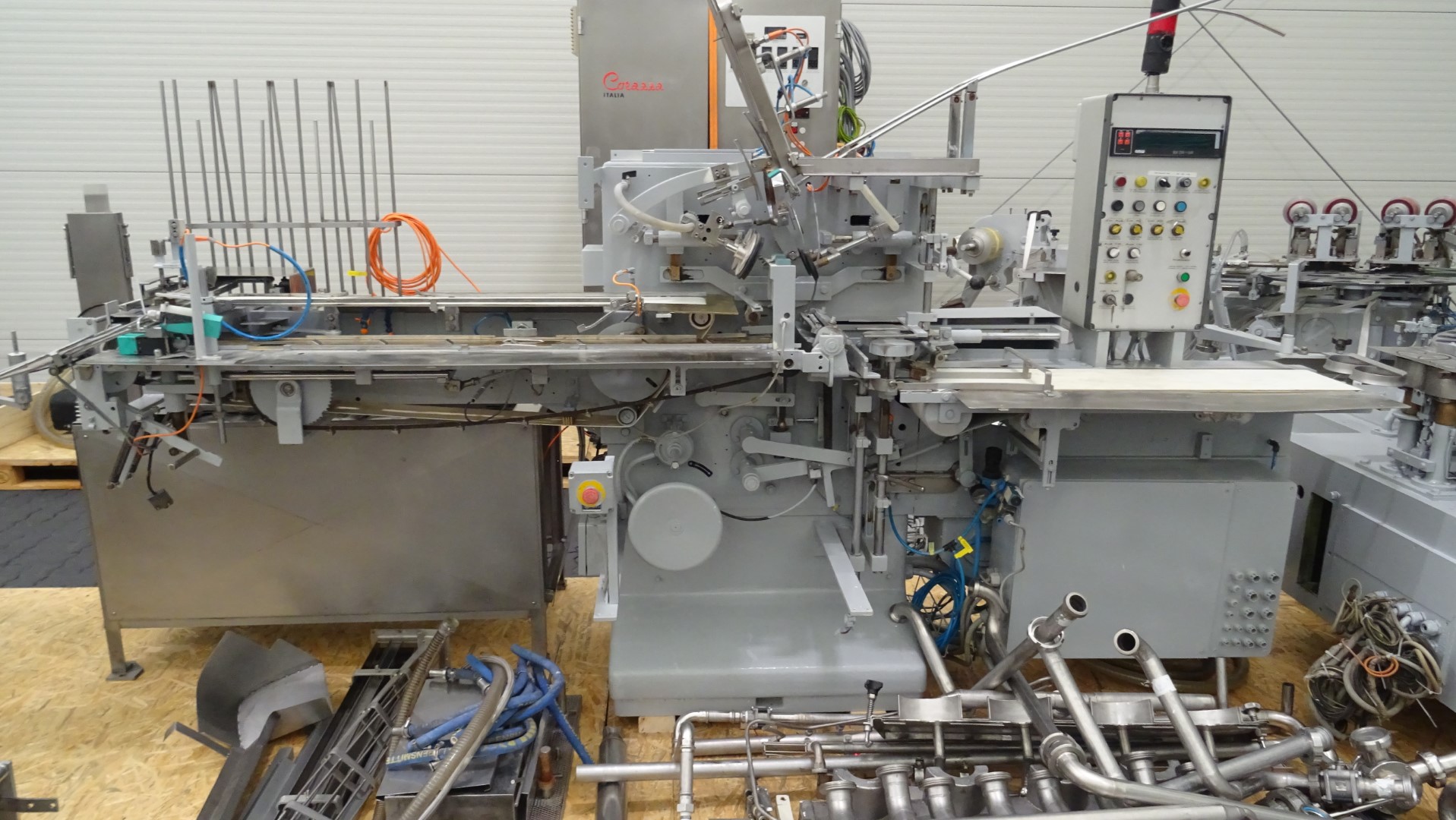 Komplette Schmelzkäse-Verpackungslinie bestehend aus einer 4x Doppelkopf-Dosier-/Verpackungsmaschine für 4x verschiedene Geschmacksrichtungen, konzipiert für die Verpackung von dreieckigen Portionen Schmelzkäse, Kartonverpackungsmaschine und eine Banderolenmaschine. Der Arbeitsprozess beginnt mit der Bildung der Verpackungshüllen aus rollengeführten Heißsiegelfolien Aluminiumfolie zum anschließenden Abfüllen des Schmelzkäses in die Dosierstation der Maschine. 4x unterschiedliche Dosier Stationen für 4 verschiedene Geschmacksrichtungen mit insgesamt 8 Fülldüsen (möglich, 4 Geschmacksrichtungen in 1 Karton in der Ende). Ein Deckel aus heißsiegelfähiger Aluminiumfolie wird in die gefüllte Schale gelegt, die dann über den Deckel gefaltet wird und durch erhitzte Druckkissen versiegelt. Jede Portion enthält einen inneren, „verbraucherfreundlichen“ Aufreißstreifen zum einfachen Öffnen und eine externes Markenetikett aus Papier. Die Portionen werden schließlich in einer 8er-Bündelkonfiguration gesammelt und zum Auslauf befördert Förderband auf einer einzigen Spur. Von hier aus wird es zur Kartoniermaschine transportiert, wo die 8 Portionen in einen Karton gegeben werden. Aufsetzen eines Deckels auf die Schachtel, Drehen der Schachtel auf den Kopf, Durchlaufen einer Banderolenmaschine zum Anbringen eines dichten Verschlusses auf der Schachtel und manuelles Verpacken in Kisten. Das Format der Maschine beträgt 25 Gramm pro Dreiecksteil, 8 pro Schachtel, 200 Gramm pro Karton Box. Das Produkt wird aus einem Edelstahltrichter mit 4 Fächern und Rührwerk zugeführt. Bedienfeld mit Siemens S5 SPS. Leitungscode: VC5705 + VC5706. Schaltplan: 1341.