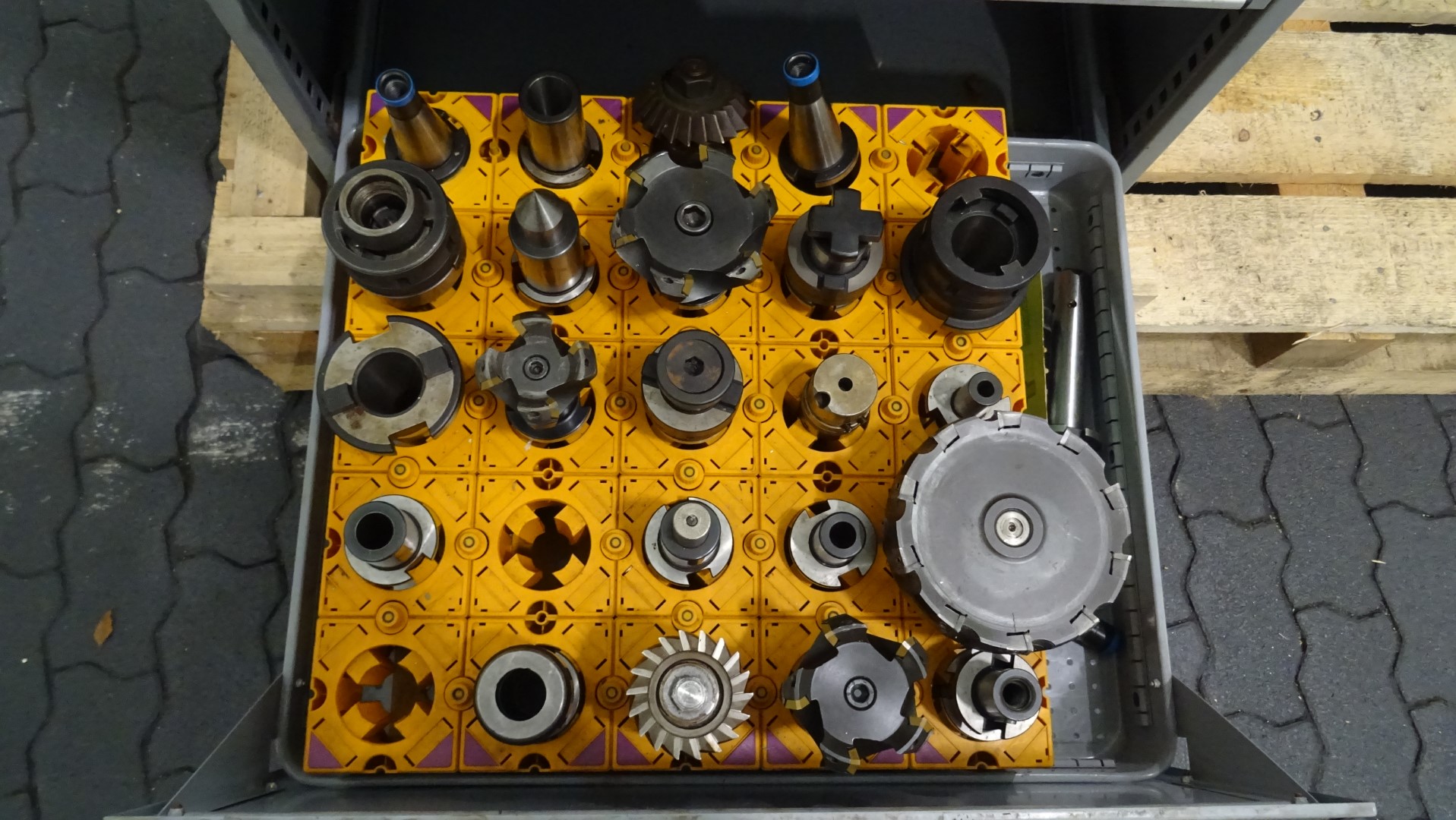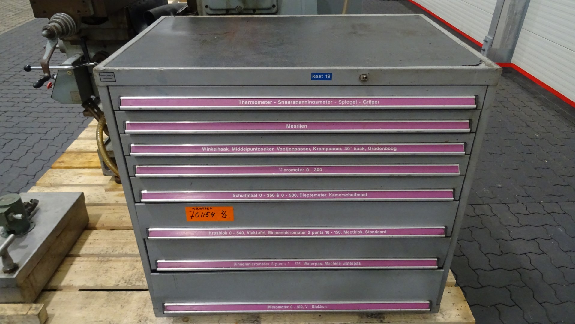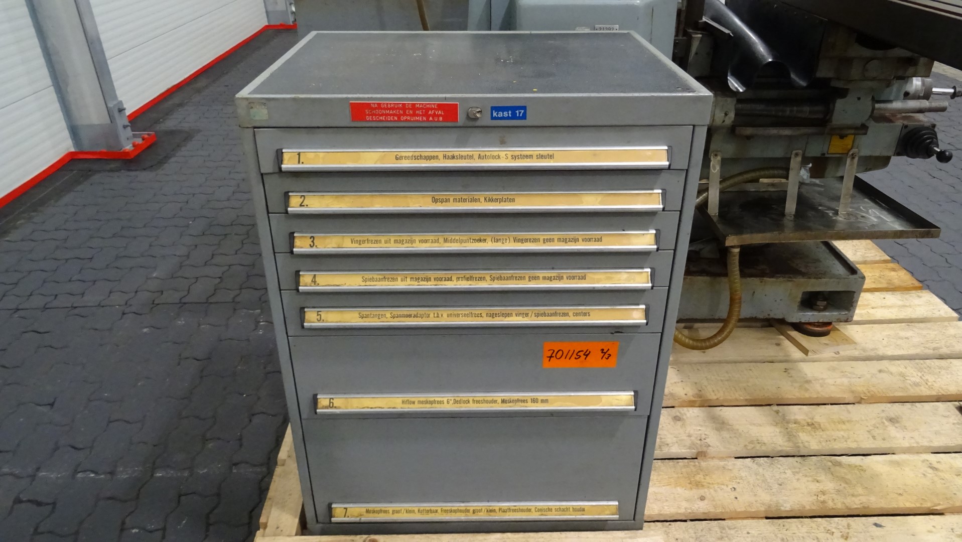 Universal vertical milling machine. Ample dimensions in relation to motor power and rating of the machine, giving high cutting capacity. Heavy knee with extra wide and long guide ways for the saddle. Direct current spindle brake. Backlash elimination for climb milling. All feed screws are precions ground. Knee screw running in an oilbath. 12 feeds for 15-900 rpm and 16 spindle feeds for 40-1.800 rpm. Including vertical milling attachment, V-2H and 2x cardboard lockers with drawers and all kind of accesoires.