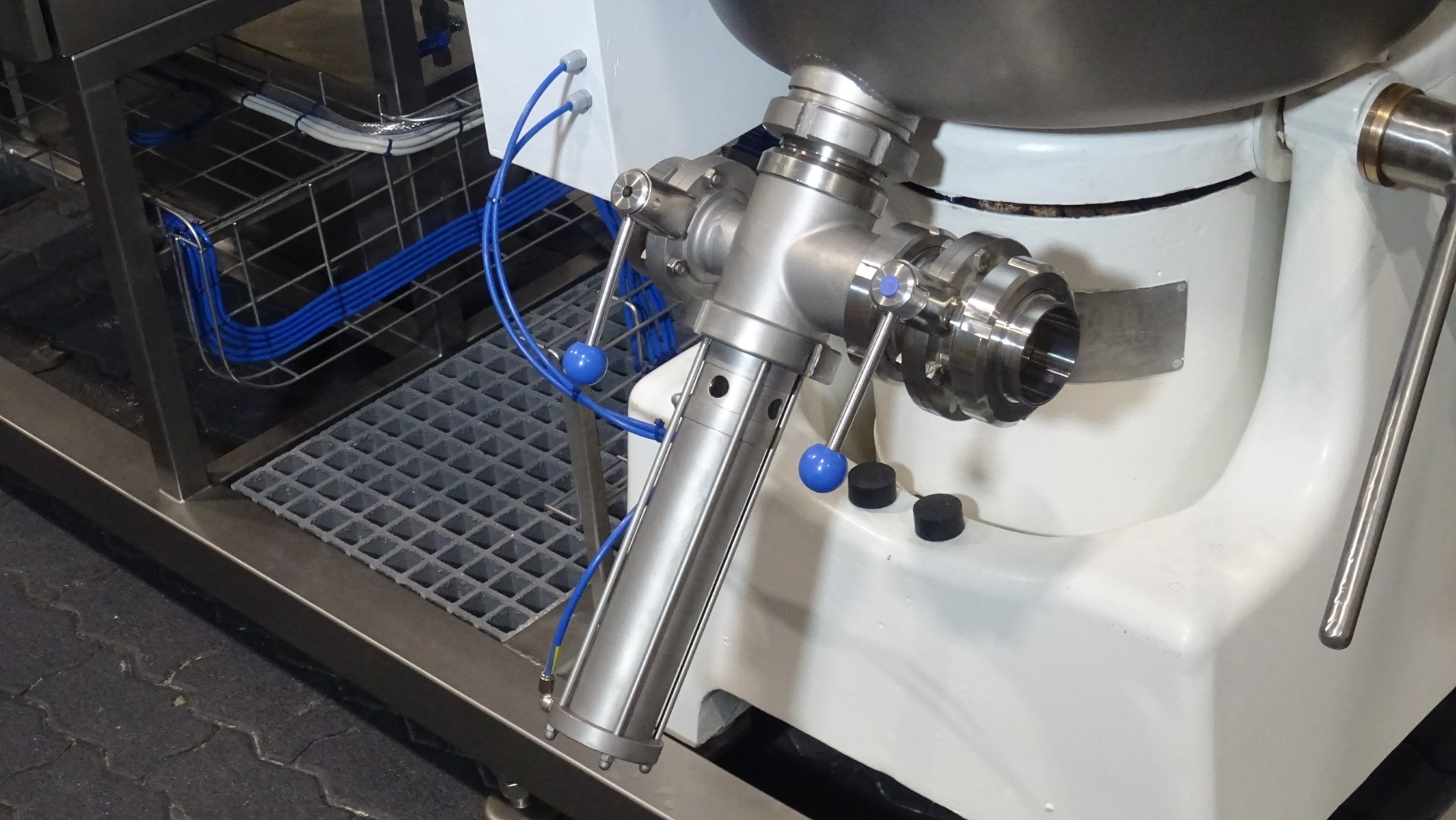 Fully reconditioned skidmounted Stephan UMM/SK 80 E Universal Machine for the production of processed cheese, convenience products, vegan spreads and confectionery. The bowl is equiped with a double jacket for heating / cooling on the jacket including all valves, 3x direct steam injection nozzles for direct injection of (culinair) steam inside the product, temperature sensor inside the product, 2x cutting blades, maximum working pressure in the bowl -1 / 1,5 bar (protected with overpressure valve), maximum temperature in the bowl 127 °C, vacuum connection on the bowl, dearation connection on the bowl, infeed connection on the lid for a hopper (hopper itself excluded), mounted on the lid a scraper agitator for the wall, electric driven (0,55 kW - n1: 1.435 rpm - n2: 29 rpm), 3 manual tightening clamp, pneumatic outfeed valve for the product, so not needed to tilt the bowl for empyting, hydraulic system including pump for easy opening the lid, vacuumpump, water valve with water flow meter, steam supply street with steam trap, steam filter and steam valves. Main motor for the cutting knife: 380 Volt - 50 Hz - 15 / 18,5 kW - 32 / 36 A - 1.450 / 2.900 rpm. New stainless steel control panel with Siemens Simatic ET200SP CPU, Siemens KTP900 Basic touch screen and Hitachi S1 frequency converter. Unit reconditioned in 2024.